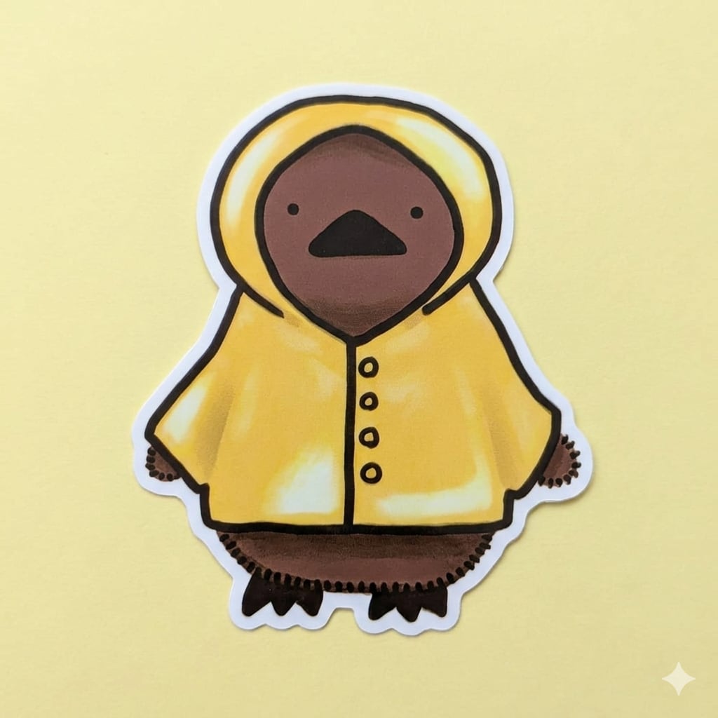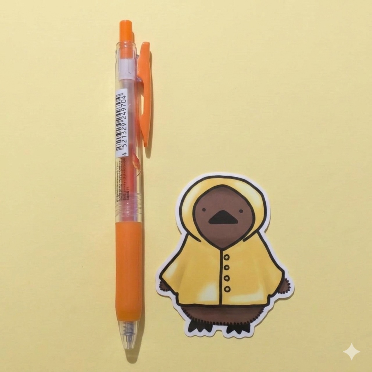 なかの丸がレインコートを着ている姿のステッカーだよ!商品写真の二枚目はサイズ比較にボールペンを横に置いているよ!